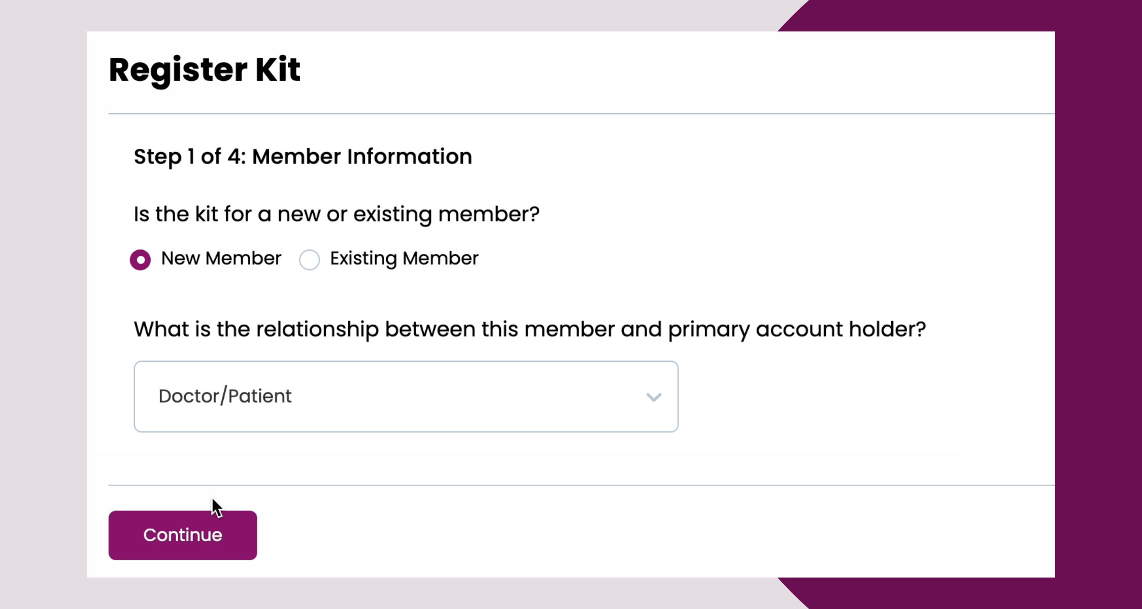 If you need to register a kit for your patient or your family member, you can select "New Member" and the relationship between you and the person being analyzed (for example Doctor/Patient).