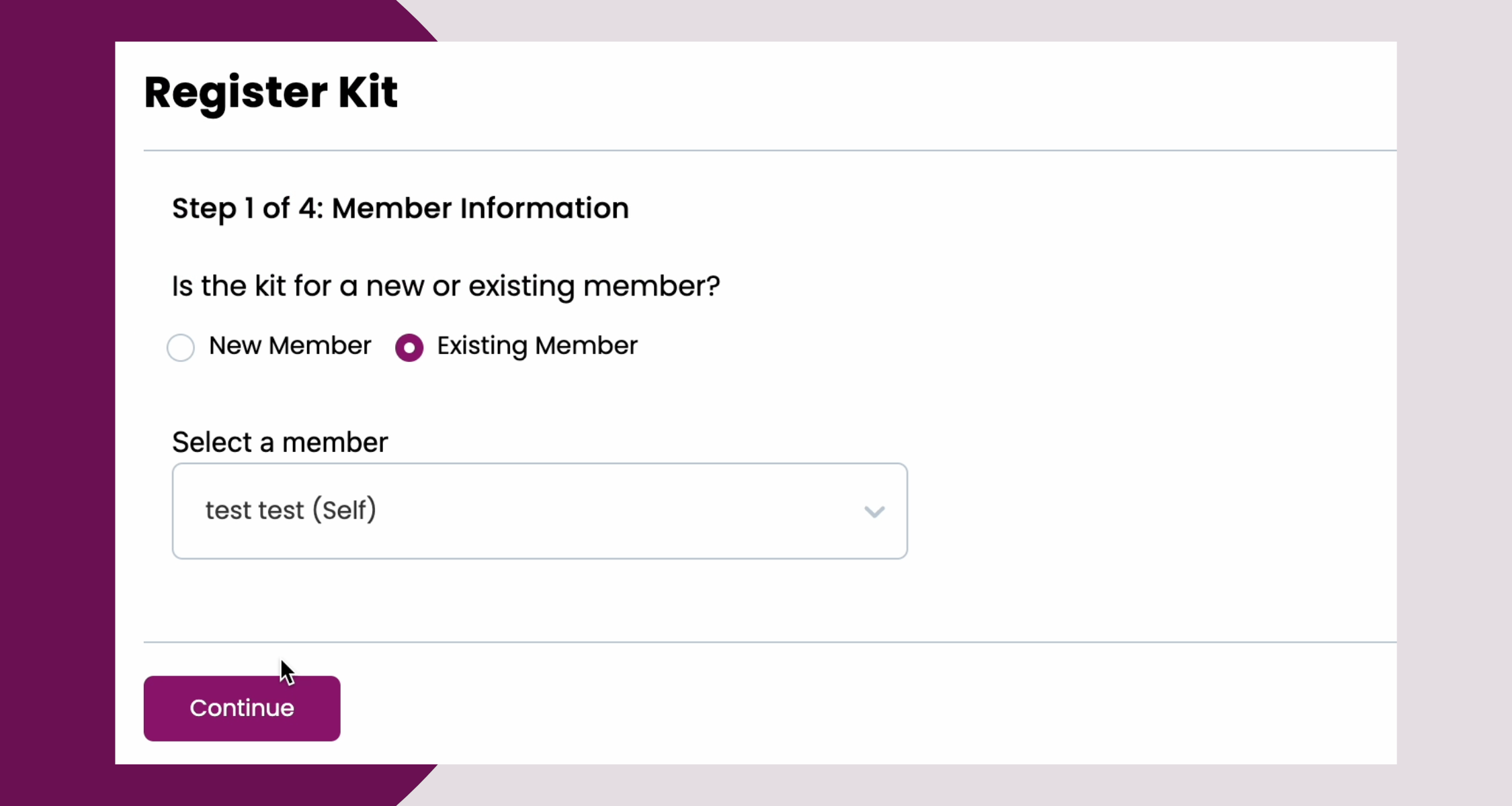 If you need to register your personal Kit you can proceed to select an existing member.